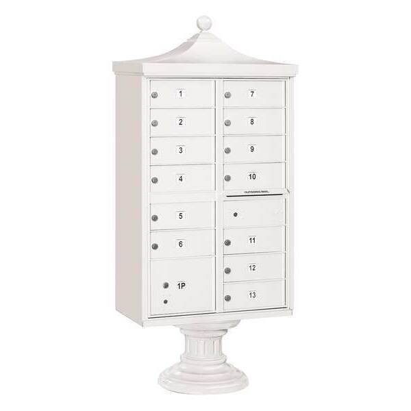 Regency Cluster Box Unit, USPS Access, Number of Doors 13, Color White, Height 71-3/4 In., Depth 18-1/2 In., Width 31 In., Box Material Aluminum, Loading Front, Mounting Pedestal, Orientation Horizontal, Slot Capacity 11-3/4 In. W x 3/4 In. H, Door Material Aluminum, Finish Powder Coated, Post Height 14-1/2 In., Post Material Aluminum, Post Thickness 12 In., Net Weight 205 lb., Standards ISO 9001: 2008, Includes Pedestal