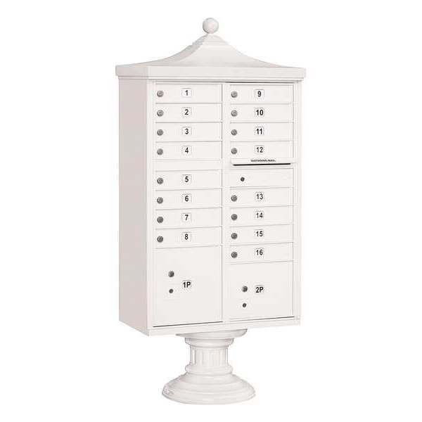 Regency Cluster Box Unit, USPS Access, Number of Doors 16, Color White, Height 71-3/4 In., Depth 18-1/2 In., Width 31 In., Box Material Aluminum, Loading Front, Mounting Pedestal, Orientation Horizontal, Slot Capacity 11-3/4 In. W x 3/4 In. H, Door Material Aluminum, Finish Powder Coated, Post Height 14-1/2 In., Post Material Aluminum, Post Thickness 12 In., Net Weight 215 lb., Standards ISO 9001: 2008, Includes Pedestal