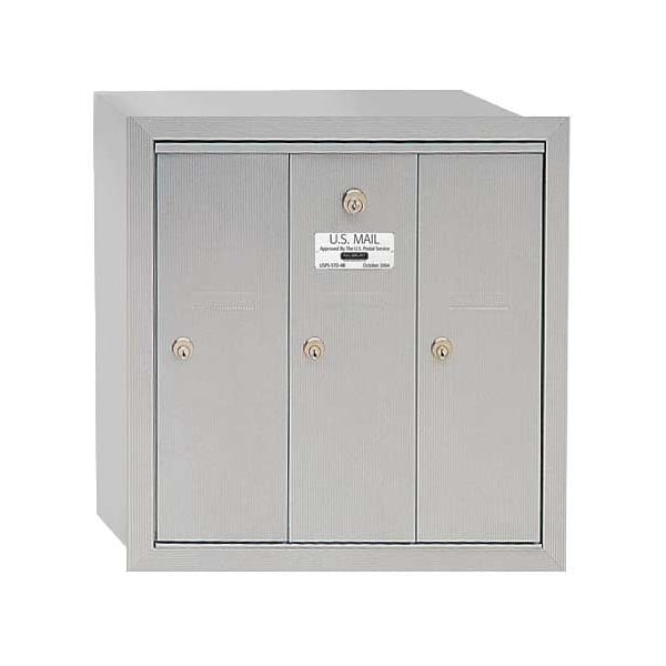 Vertical Mailbox, 3 Number of Doors, Color Aluminum, Height 19 In, Depth 7 1/2 In, Width 18 3/4 In, Aluminum Box Material, Front Loading, Recessed Mounting, Door Material Aluminum, Powder Coated Finish, Net Weight 25 Lb, USPS Standards