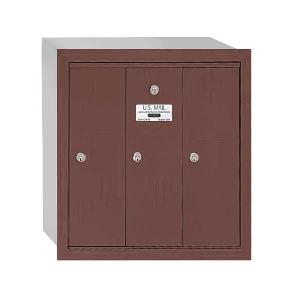 Vertical Mailbox, 3 Number of Doors, Color Bronze, Height 19 In, Depth 7 1/2 In, Width 18 3/4 In, Aluminum Box Material, Front Loading, Recessed Mounting, Door Material Aluminum, Powder Coated Finish, Net Weight 25 Lb, USPS Standards