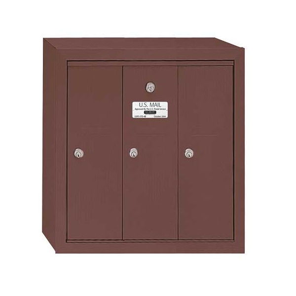 Vertical Mailbox, 3 Number of Doors, Color Bronze, Height 19 In, Depth 7 1/2 In, Width 18 3/4 In, Aluminum Box Material, Front Loading, Surface Mounting, Door Material Aluminum, Powder Coated Finish, Net Weight 25 Lb, USPS Standards