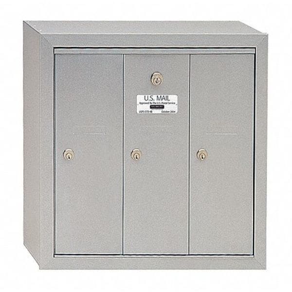 Vertical Mailbox, 3 Number of Doors, Color Aluminum, Height 19 In, Depth 7 1/2 In, Width 18 3/4 In, Aluminum Box Material, Front Loading, Surface Mounting, Door Material Aluminum, Powder Coated Finish, Net Weight 25 Lb, USPS Standards