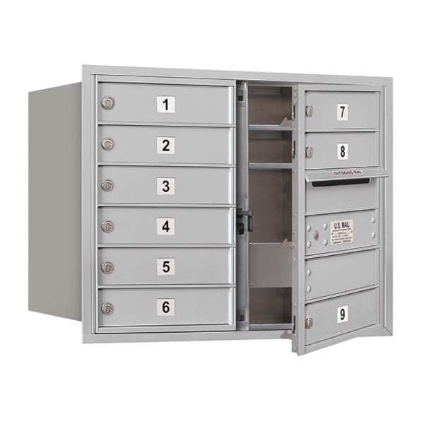 Horizontal Mailbox, USPS, Number of Doors 9, Color Aluminum, Height 23-1/2 In., Depth 17 In., Width 31-1/8 In., Box Material Aluminum, Loading Front, Mounting Recessed, Orientation Horizontal, Slot Capacity 10-3/4 In. W x 3/4 In. H, Door Material Aluminum, Finish Powder Coated, For Use With Mfr. No. 3906D-ALM, 3806D-ALM, Net Weight 90 lb., Standards ISO 9001: 2008, Includes Locks, Master Commercial Lock and Pedestal