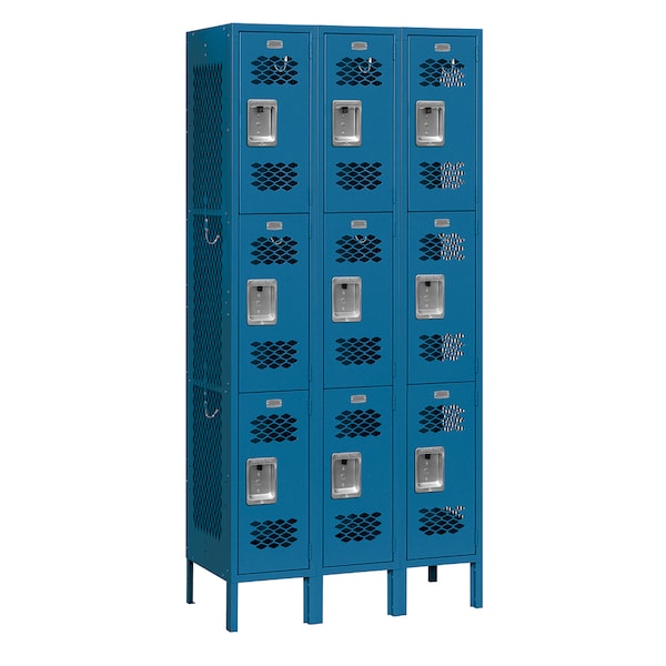 Constructed of 16 gauge steel, Salsbury 73000 series 12" wide triple tier vented lockers effectively combine visibility and maximum air flow with security. Vented lockers are ideal for dressing rooms, locker rooms and athletic clubs. Measuring five (5) feet and six (6) feet in height (add 6'' for legs) and depths of 12'', 15'' and 18'', these durable lockers are available in a gray, tan or blue powder coated finish and as unassembled or assembled units. One wide lockers are 12" wide and three (3) wide lockers are 36" wide regardless of height and depth. 12" wide triple tier vented lockers include three (3) single wall hooks. Sloping hoods, finished end panels, end bases, front bases, compartment shelves, fillers and lockers without legs are available as options upon request.