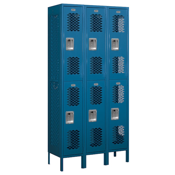 Constructed of 16 gauge steel, Salsbury 72000 series 12" wide double tier vented lockers effectively combine visibility and maximum air flow with security. Vented lockers are ideal for dressing rooms, locker rooms and athletic clubs. Measuring five (5) feet and six (6) feet in height (add 6'' for legs) and depths of 12'', 15'' and 18'', these durable lockers are available in a gray, tan or blue powder coated finish and as unassembled or assembled units. One wide lockers are 12" wide and three (3) wide lockers are 36" wide regardless of height and depth. 12" wide double tier vented lockers include three (3) single wall hooks and a double ceiling hook. Sloping hoods, finished end panels, end bases, front bases, compartment shelves, fillers and lockers without legs are available as options upon request.