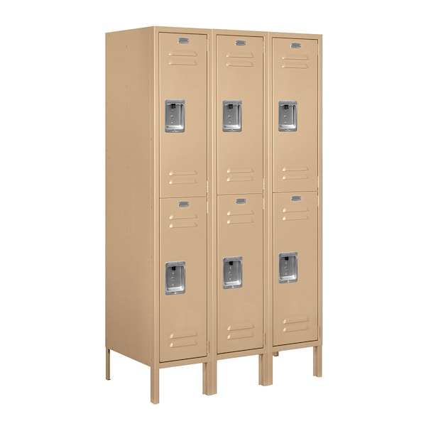 Constructed of 16 gauge steel, Salsbury 62000 series 12" wide double tier standard lockers provide maximum privacy for individuals and are ideal wherever storage space is limited. Measuring five (5) feet and six (6) feet in height (add 6'' for legs) and depths of 12'', 15'' and 18'', these durable lockers are available in a gray, tan or blue powder coated finish and as unassembled or assembled units. One wide lockers are 12" wide and three (3) wide lockers are 36" wide regardless of height and depth. 12" wide double tier standard lockers feature three (3) single wall hooks and a double ceiling hook. Sloping hoods, finished end panels, end bases, front bases, compartment shelves, fillers and lockers without legs are available as options upon request.