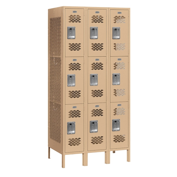 Constructed of 16 gauge steel, Salsbury 73000 series 12" wide triple tier vented lockers effectively combine visibility and maximum air flow with security. Vented lockers are ideal for dressing rooms, locker rooms and athletic clubs. Measuring five (5) feet and six (6) feet in height (add 6'' for legs) and depths of 12'', 15'' and 18'', these durable lockers are available in a gray, tan or blue powder coated finish and as unassembled or assembled units. One wide lockers are 12" wide and three (3) wide lockers are 36" wide regardless of height and depth. 12" wide triple tier vented lockers include three (3) single wall hooks. Sloping hoods, finished end panels, end bases, front bases, compartment shelves, fillers and lockers without legs are available as options upon request.