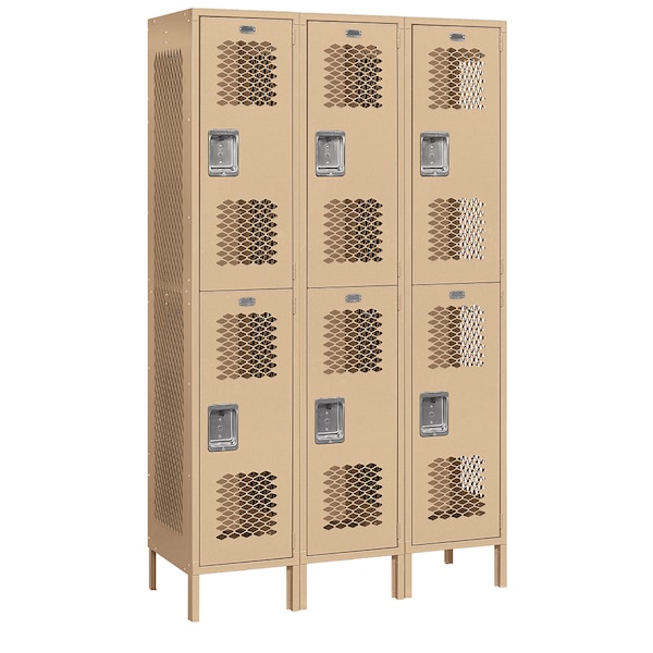 Constructed of 16 gauge steel, Salsbury 82000 series 15" wide double tier vented lockers provide visibility and maximum air flow with ample storage space for athletic and other environments. Double tier 15" wide vented lockers are available in a gray, tan or blue powder coated finish and as unassembled or assembled units. One wide lockers are 15" wide and three (3) wide lockers are 45" wide. These spacious lockers are six (6) feet high (add 6'' for legs) and are available in 15'' and 18'' depths. 15" wide double tier vented lockers include a ceiling hook and three (3) wall hooks. Sloping hoods, finished end panels, end bases, front bases, compartment shelves, fillers and lockers without legs are available as options upon request.