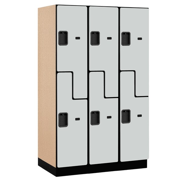 Constructed of industrial grade particleboard and covered with durable high pressure laminate, Salsbury 27000 series 15" wide double tier 'S' style designer wood lockers offer ample space for personal storage needs and are ideal for settings where a professional environment is desired. These spacious 15" wide designer wood lockers feature a gray, blue, black, maple, cherry or mahogany finish and are available in 18”, 21” and 24” depths. Optional matching laminated sloping hoods and side panels easily attach to 15" wide designer lockers and provide a finished look to an individual locker or a row of lockers. 15" wide designer lockers include a 4” high black base and measure six (6) feet high (add 4” for the base). All locker doors are 15’’ W x 3/4’’ D and include a black name / number plate. All locker doors also include heavy duty concealed hinges and a lift up handle and recessed hasp. One wide extra wide designer lockers are available as fully assembled units only. Three (3) wide extra wide designer lockers are also available as fully assembled units only and require minor assembly.