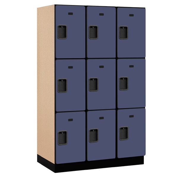 Constructed of industrial grade particleboard and covered with durable high pressure laminate, Salsbury 23000 series 15" wide triple tier designer wood lockers offer ample space for personal storage needs and are ideal for settings where a professional environment is desired. These spacious 15" wide designer wood lockers feature a gray, blue, black, maple, cherry or mahogany finish and are available in 18”, 21” and 24” depths. Optional matching laminated sloping hoods and side panels easily attach to extra wide designer lockers and provide a finished look to an individual locker or a row of lockers. 15" wide designer wood lockers include a 4” high black base and measure six (6) feet high (add 4” for the base). All locker doors are 15’’ W x 3/4’’ D and include a black name / number. All locker doors also include heavy duty concealed hinges and a lift up handle and recessed hasp. One wide extra wide designer lockers are available as fully assembled units only. Three (3) wide extra wide designer lockers are also available as fully assembled units only and require minor assembly.