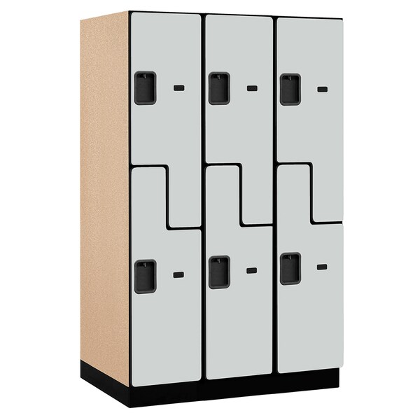Constructed of industrial grade particleboard and covered with durable high pressure laminate, Salsbury 27000 series 15" wide double tier 'S' style designer wood lockers offer ample space for personal storage needs and are ideal for settings where a professional environment is desired. These spacious 15" wide designer wood lockers feature a gray, blue, black, maple, cherry or mahogany finish and are available in 18”, 21” and 24” depths. Optional matching laminated sloping hoods and side panels easily attach to 15" wide designer lockers and provide a finished look to an individual locker or a row of lockers. 15" wide designer lockers include a 4” high black base and measure six (6) feet high (add 4” for the base). All locker doors are 15’’ W x 3/4’’ D and include a black name / number plate. All locker doors also include heavy duty concealed hinges and a lift up handle and recessed hasp. One wide extra wide designer lockers are available as fully assembled units only. Three (3) wide extra wide designer lockers are also available as fully assembled units only and require minor assembly.