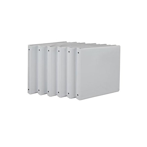 Samsill Economy View Binder, Round Ring, White, .5". Customizable clear overlay on front, back, and spine. Exposed-rivet construction and two clear inside pockets. Contains 40% post-consumer recycled content. Premium quality vinyl tightly sealed over rigid board. Special ribbed seal adds flexible strength at the hinge. White. This item contains 6 binders. Individual binders are not labeled for resale.