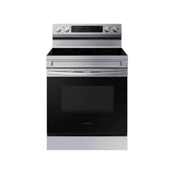 Elevate the look of your kitchen with Samsung's new freestanding electric range. This range uses upgraded technology to make cooking in your home simple and fun. With a simple push of a button, you can proof bread, dehydrate your favorite jerky and keep meals warm in the oven with precision. And if you have a favorite recipe, conveniently save the settings in the SmartThings mobile app and send them to your oven. Boil water for your favorite pasta dish fast with the 3300 W Rapid Boil burner. Keep your oven clean with ease with our convenient Self Clean and Steam Clean options, and Hidden Baking Element feature. Preheat, adjust time and temperature of your oven, and monitor your cooktop from wherever you are with your smartphone