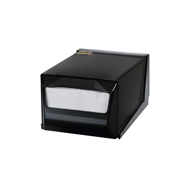 Countertop napkin dispenser; Body is 20 ga steel with black finish; Base is high-impact plastic; Black Pearl face; Eliminates waste by dispensing napkins one-at-a-time; Holds 300 fullfold napkins; 7 5/8"W x 11"D x 5 1/2"H