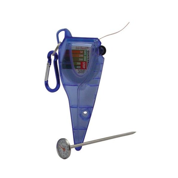 Quaternary measurer with thermometer (0° to 200°F); Integrated pocket clip and detachable carabiner make storage easy and keep Saf-CheckTM handy; Easy to operate thumbwheel turns to dispense replaceable 15 foot roll of quaternary test strips; Includes (1) replaceable 15 foot test strip roll and (1) thermometer; Refillable roll cartridge protects roll from chemicals or splashing; Integrated bimetallic thermometer calibration tool ensures proper temperature readings; Two sizes (front/back) accommodate leading thermometer brands; Innovative Smart ScaleTM makes reading test strip results easy: GREEN = safe; RED = change solution