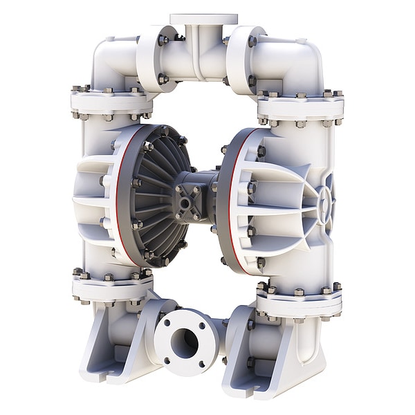 Double Diaphragm Pump, Air Consumption (Maximum) 150 scfm, Air Intake Connection Size 3/4 in, Air Intake Connection Type Flange, Check Seat Material Polypropylene, Diaphragm Material PTFE, Feet of Head (Maximum) 231 ft, Flow Rate (Maximum) 280 gpm, Manifold Connection Single Port, Media Discharge Connection Size 3 in, Media Discharge Connection Type Flange, Media Discharge Location Center, Top, Media Intake Connection Size 3 in, Media Intake Connection Type Flange