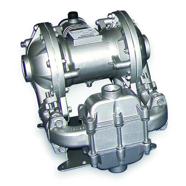 Double Diaphragm Pump, Air Consumption (Maximum) 50 scfm, Air Intake Connection Size 1/2 in, Air Intake Connection Type FNPT, Check Seat Material Ryton, Diaphragm Material Santoprene, Feet of Head (Maximum) 289 ft, Flow Rate (Maximum) 42 gpm, Manifold Connection Single Port, Media Discharge Connection Size 1 in, Media Discharge Connection Type NPT, Media Discharge Location Center, Top, Media Intake Connection Size 1 in, Media Intake Connection Type NPT, Media Intake Location Bottom, Center