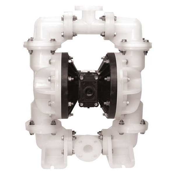 Double Diaphragm Pump, Air Consumption (Maximum) 80 scfm, Air Intake Connection Size 3/4 in, Air Intake Connection Type NPT, Check Seat Material Polypropylene, Diaphragm Material PTFE, Feet of Head (Maximum) 231 ft, Flow Rate (Maximum) 200 gpm, Manifold Connection Single Port, Media Discharge Connection Size 2 in, Media Discharge Connection Type Flange, Media Discharge Location Center, Top, Media Intake Connection Size 2 in, Media Intake Connection Type Flange
