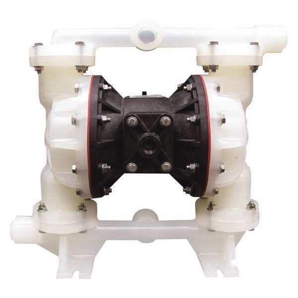 Double Diaphragm Pump, Air Consumption (Maximum) 45 scfm, Air Intake Connection Size 1/2 in, Air Intake Connection Type FNPT, Check Seat Material Polypropylene, Diaphragm Material PTFE, Feet of Head (Maximum) 231 ft, Flow Rate (Maximum) 53 gpm, Manifold Connection Single Port, Media Discharge Connection Size 1 in, Media Discharge Connection Type NPT, Media Discharge Location Center, Top, Media Intake Connection Size 1 in, Media Intake Connection Type NPT, Media Intake Location Bottom, Center