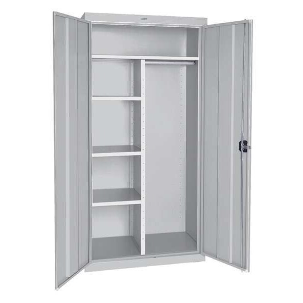 Storage Cabinet, Base Type Frame, Body Panel Type Solid, Cabinet Color Light Gray, Cabinet Material Steel, Cabinet Storage Components Hanging Rods, Shelves, Door Handle Type Recessed Pull, Door Type Solid, Duty Rating Medium Duty, For Use Indoors/Outdoors No, Frame Assembled Assembled, Load Capacity per Shelf 200 lb, Lock Type Keyed, Mobility Stationary, Mounting Location Freestanding, Number of Shelves 4, Overall Depth 18 in, Overall Height 72 in, Overall Width 36 in, Audit Trail Storage None