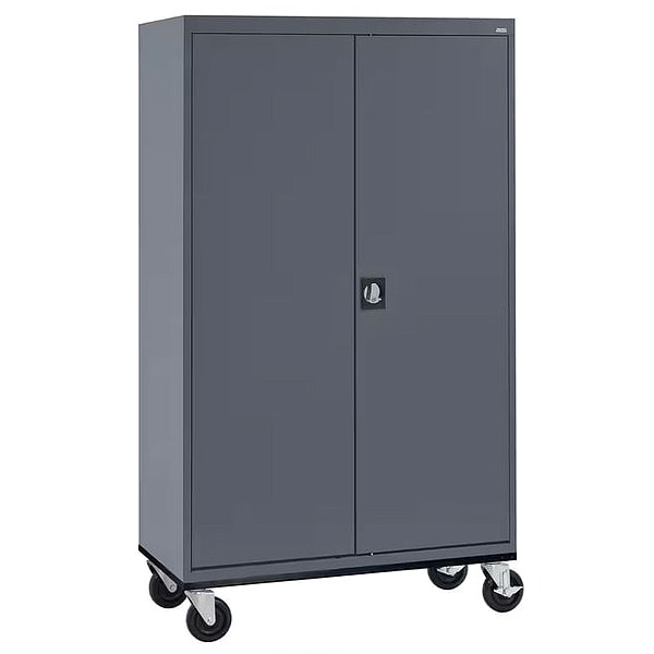 Storage Cabinet, Base Type Casters, Body Panel Type Solid, Cabinet Color Dark Gray, Cabinet Material Steel, Cabinet Storage Components Shelves, Door Handle Type Recessed Pull, Door Type Solid, Duty Rating Medium Duty, For Use Indoors/Outdoors No, Frame Assembled Assembled, Load Capacity per Shelf 230 lb, Lock Type Keyed, Mobility Mobile, Mounting Location Freestanding, Number of Shelves 4, Overall Depth 24 in, Overall Height 78 in, Overall Width 46 in, Audit Trail Storage None