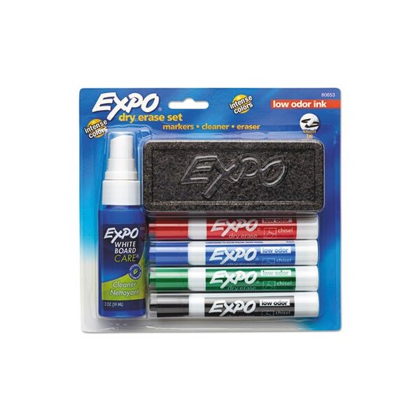 Expo Low Odor Dry Erase Markers Starter Set has everything you need to get started working on your whiteboard. The set includes an eraser, cleaning spray and colorful whiteboard markers. The dry erase markers feature bold ink thats easy to see from a distance and provides consistent color quality. The dry erase marker ink is specially formulated to be low-odor making it perfect for use in classrooms, offices and homes. Use your Expo dry erase marker kit to track, schedule and present. Marker Ink Type: Dry Erase; Marker Tip Type: Chisel; Marker Tip Size text: Broad; Marker Colors: Assorted.