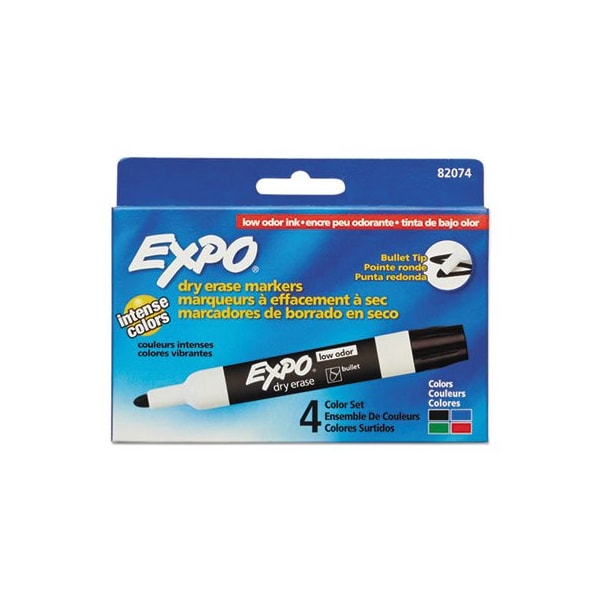 Markers feature bold ink that's easy to see from a distance and provide consistent color quality. These Expo dry erase markers erase cleanly and easily from whiteboards and other non-porous surfaces with a dry cloth or Expo eraser. The dry erase marker ink is specially formulated to be low-odor, making it perfect for use in classrooms, offices and homes. Use your Expo whiteboard markers to track, schedule and present. Marker Ink Type: Dry Erase; Marker Tip Type: Bullet; Marker Tip Size text: Medium; Marker Colors: Assorted.