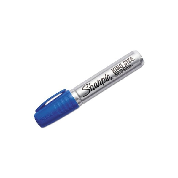 Designed for industrial users, Sharpie Professional King Size Permanent Markers write on most surfaces including wet and oily surfaces. The rugged plastic barrel and sturdy felt tip make this marker ideal for the toughest marking jobs. Featuring an extra-large ink supply, this permanent marker is long lasting and withstands heavy use. Marker Ink Type: Permanent; Marker Tip Type: Chisel; Marker Tip Size text: Broad; Marker Colors: Blue.