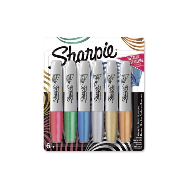 The permanent marker with a split personality, these chisel tip permanent markers have a versatile tip that makes both broad and fine strokes so you can express yourself any way you want. Bold to the max and permanent to the core, Sharpie Permanent Markers inspire you to transform ordinary surfaces into passionately creative statements. Made to write practically everywhere, these vivid markers eliminate dull and boring. Sharpie has iconic ink that dries quickly and resists both water and fading. Marker Ink Type: Permanent; Marker Tip Type: Chisel; Marker Tip Size text: Medium; Marker Colors: Assorted.