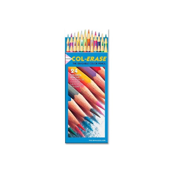 colored pencils feature a special lead formula that erases effortlessly. Rendered lines erase clean with few strokes of the eraser. Ideal for illustration, animation and accounting applications. 24-color set includes black, blue, brown, canary yellow, carmine red, grass green, green, indigo blue, lavender, light blue, light green, light gray, light peach, orange, pink, purple, rose, scarlet red, terra cotta, tuscan red, vermillion, violet, white and yellow. Pma certified nontoxic, thin lead is strong and resists breakage. Pencil design also includes a metal ferrule with twin band and red eraser.