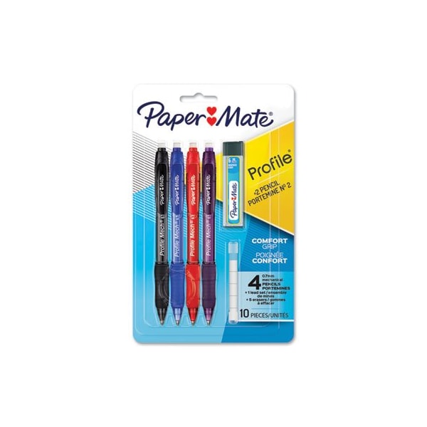 Paper Mate Profile Mech Mechanical Pencils combine the look and feel of a pen with the performance and versatility of a pencil, so you stay sharp during any writing task. They feature a comfortable grip that helps you keep writing until the job is done. These pencils contain 0.7 mm HB #2 pencil lead, making them great for school, home, or the office and perfect for standardized testing. Retractable Yes/No: Yes; Eraser Yes/No: Yes; Graphite Colors: Black; Color Family: Black.