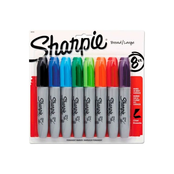 the permanent marker with a split personality, sharpie chisel tip permanent markers have a versatile tip that makes both broad and fine strokes--so you can express yourself any way you want. Bold to the max and permanent to the core, sharpie permanent markers inspire you to transform ordinary surfaces into passionately creative statements. Made to write practically everywhere, vivid sharpie markers eliminate dull and boring. Sharpie has iconic ink that dries quickly and resists both water and fading. While pale imitations wither away, sharpie markers make creations that endure. ink colors: black; blue; green; lime; orange; purple; red; turquoise this product arrives to most customers in 2-3 business days.