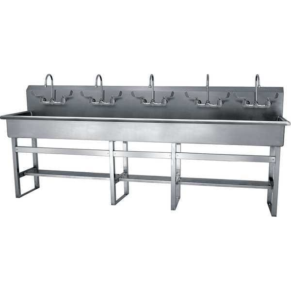 Wash Station 5-Person Wall Mount, Material of Construction 304 Stainless Steel, Gauge 16, Overall Length (In.) 100 In., Overall Width (In.) 20 In., Overall Height (In.) 18 In., Number of Stations 5, Bowl Single, Bowl Size (In.) 97 x 16-1/2 x 8D, Back Splash 10 In., Side Splash No, Mounting Type Floor, Faucet Mounting Centers (In.) 8 In., Number of Holes 10, Drain Opening (In.) 2 In., Color/Finish Satin, ADA Compliant No, Standards NSF/ANSI 372, Minority, Woman or Disadvantaged Business