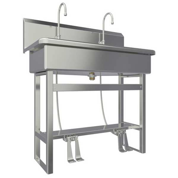 Hands Free Wash Station, Material of Construction 304 Stainless Steel, Gauge 16, Overall Length (In.) 40, Overall Width (In.) 20, Overall Height (In.) 45, Number of Stations 2, Bowl Single, Bowl Size (In.) 37 x 16-1/2 x 8D, Back Splash 10 In., Side Splash No, Mounting Type Splash, Number of Holes 2, Drain Opening (In.) 2, Color/Finish Satin, ADA Compliant No, Standards NSF/ANSI Standard 2 - Food Equipment and NSF/ANSI 372 low-lead, Compliance Minority, Woman or Disadvantaged Business