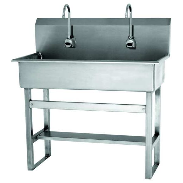 Hands Free Wash Station, Material of Construction 304 Stainless Steel, Gauge 16, Overall Length (In.) 40, Overall Width (In.) 20, Overall Height (In.) 45, Number of Stations 2, Bowl Single, Bowl Size (In.) 37 x 16-1/2 x 8D, Back Splash 10 In., Side Splash No, Mounting Type Splash, Number of Holes 2, Drain Opening (In.) 2, Color/Finish Satin, ADA Compliant No, Standards NSF/ANSI Standard 2 - Food Equipment and NSF/ANSI 372 low-lead, Compliance Minority, Woman or Disadvantaged Business