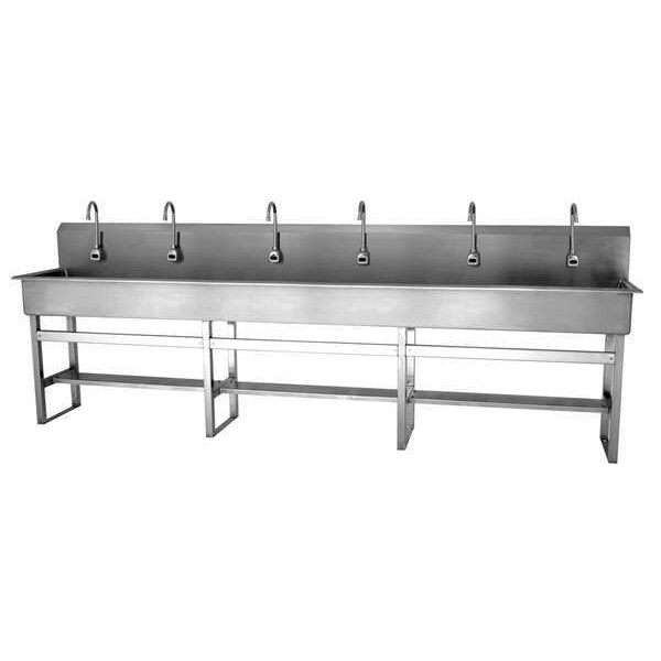 Hands Free Wash Station, Material of Construction 304 Stainless Steel, Gauge 16, Overall Length (In.) 120, Overall Width (In.) 20, Overall Height (In.) 45, Number of Stations 6, Bowl Single, Bowl Size (In.) 117 x 16-1/2 x 8D, Back Splash 10 In., Side Splash No, Mounting Type Splash, Number of Holes 6, Drain Opening (In.) 2, Color/Finish Satin, ADA Compliant No, Standards NSF/ANSI Standard 2 - Food Equipment and NSF/ANSI 372 low-lead, Compliance Minority, Woman or Disadvantaged Business