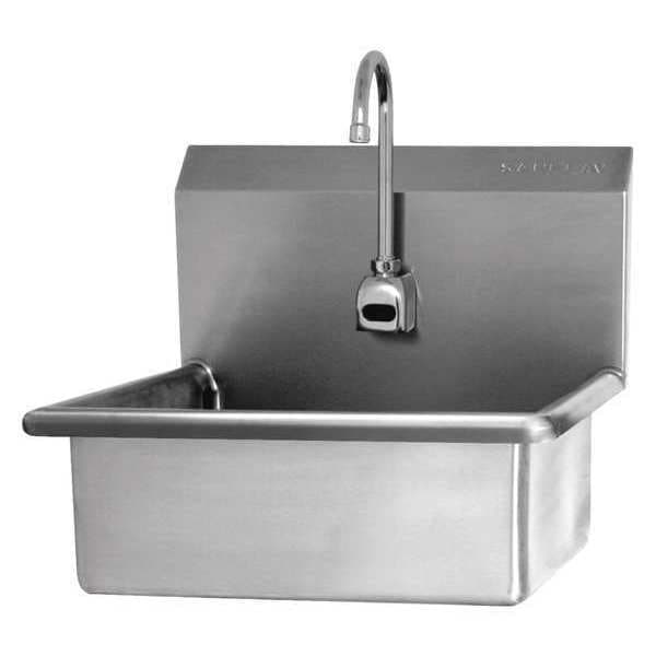 Mount Sink, With Faucet, Body Material Stainless Steel, Mounting Type Wall, Color Stainless Steel, Overall Length 23 In., Overall Width 20-1/2 In., Overall Height 19-1/2 In., Bowl Size 20 In. x 17 In. x 9 In., Bowl Depth 9 In., ADA Compliant No, Back Splash Yes, Bowl Shape Rectangular, Back Splash Height 10-1/2 In., Side Splash No, Faucet Operation AC Sensor, Number of Stations 1, Drain Opening 2 In., Finish Polished, Gauge 16, Faucet Mounting Centers Center Hole Only, Faucet Hole Dia. 7/8 In.