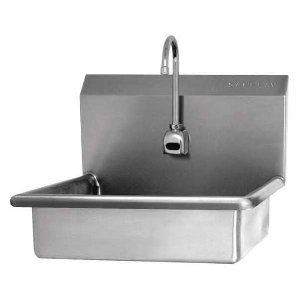 Mount Sink, With Faucet, Body Material Stainless Steel, Mounting Type Wall, Color Stainless Steel, Overall Length 22 In., Overall Width 19 In., Overall Height 14 In., Bowl Size 19 In. x 15-1/2 In. x 5 In., Bowl Depth 5 In., ADA Compliant Yes, Back Splash Yes, Bowl Shape Rectangular, Back Splash Height 9 In., Side Splash No, Faucet Operation Battery Sensor, Number of Stations 1, Drain Opening 2 In., Finish Polished, Gauge 16, Faucet Mounting Centers Center Hole Only, Faucet Hole Dia. 7/8 In.