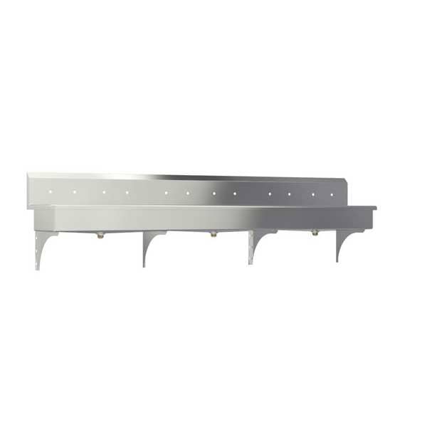 Six Person Wash Station, Stainless Steel, 16 Gauge, Overall Length 120 In., Overall Width 20 In., Overall Height 18 In., Number of Stations 6, Single Bowl, Bowl Size 8D x 117L x 16.5W In., Mounting Type Wall, Faucet Mounting Centers 8 In., Number of Holes 12, Drain Opening 2 In., Satin Finish Color/Finish, Standards NSF, Includes Wall Mounting Brackets and Strainers