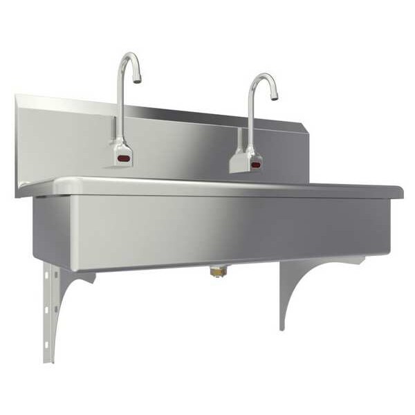 Hands Free Wash Station, Material of Construction 304 Stainless Steel, Gauge 16, Overall Length (In.) 40, Overall Width (In.) 20, Overall Height (In.) 18, Number of Stations 2, Bowl Single, Bowl Size (In.) 37 x 16-1/2 x 8D, Back Splash 10 In., Side Splash No, Mounting Type Splash, Number of Holes 2, Drain Opening (In.) 2, Color/Finish Satin, ADA Compliant No, Standards NSF/ANSI Standard 2 - Food Equipment and NSF/ANSI 372 low-lead, Compliance Minority, Woman or Disadvantaged Business