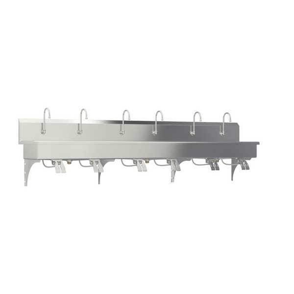 Hands Free Wash Station, Material of Construction 304 Stainless Steel, Gauge 16, Overall Length (In.) 120, Overall Width (In.) 20, Overall Height (In.) 18, Number of Stations 6, Bowl Single, Bowl Size (In.) 117 x 16-1/2 x 8D, Back Splash 10 In., Side Splash No, Mounting Type Splash, Number of Holes 6, Drain Opening (In.) 2, Color/Finish Satin, ADA Compliant No, Standards NSF/ANSI Standard 2 - Food Equipment and NSF/ANSI 372 low-lead, Compliance Minority, Woman or Disadvantaged Business