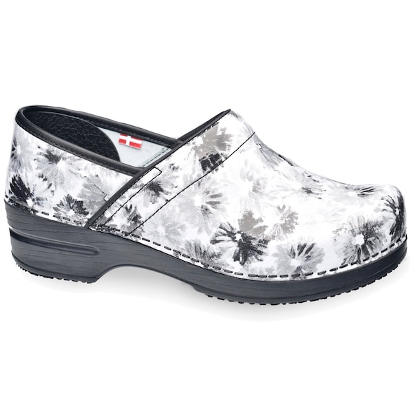 Brush blot print patent leather clog. Padded Instep. Certified Slip Resistant. Cushioned microfiber insole. Rocker Bottom. Anatomically correct footbed with breathable cushioned microfiber insole