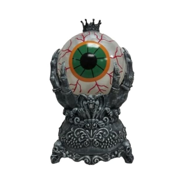 Spooky Halloween illuminated Eyeball Water Globe held by a skeleton hand. Made of sturdy plastic.