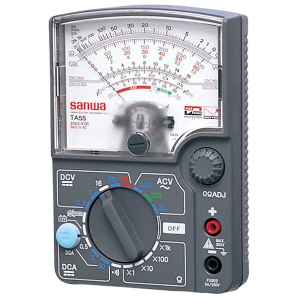 30 Amp Analog Multimeter is Designed Specifically for Automotive Use.The Sanwa TA55 is a portable analog multi-tester that comes with a color-matching scale and high DC current measurement for automotive applications.The TA55 multimeter is a taut-band type meter with an easy color matching scale and measurement ranges for DCV, DCA, & ACV measurements. The TA55 can measure DC current of up to 30 Amperes or 300 Amperes DC using an optional CL33DC clamp. The device can measure a maximum of 60 Volts DC and 300 Volts AC making it perfect for measuring home electrical outlets and electric appliances. Measuring resistances of up to 2M and continuity test with a buzzer that sounds at less than approximately 70 is also possible with a TA-55 analog multi-tester. The device has a protective casing that provides protection against drop shocks and has a 250V / 3A breaking capacity 300A fast-blow fuse for protecting the internal circuity of this instrument.Includes meter, one set of test leads and instruction manual.