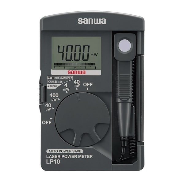 This instrument is a pocket-sized laser power meter featuring outstanding design and portability.The Sanwa LP10 is a Digital Laser Power Meter that features a 4039 count LCD display with an analog bar graph. This is used in checking and maintenance of the optical power levels of equipment using laser light.Using 633 nm of a He-Ne laser as the reference wavelength, this instrument enables direct reading of the optical power of visible-range laser light from a visible laser source - pointer, DVD players optical pickup, etc. The power of other wavelengths can also be measured by converting the reading according to the spectral sensitivity characteristic table typical values.The light sensor in this device is a silicon photodiode light sensor surface diameter 9 mm with a diffusion sheet. It can measure wavelengths within the 400 nm to 1100 nm range. The cleverly designed cover folds flat in back of the unit when in use, and protects the unit when closed.