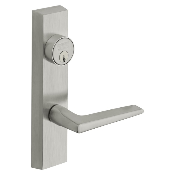 Grade 1 Exit Device Trim, Classroom Function, Key Outside Unlocks/Locks Trim, For Surface Vertical Rod and Mortise 8700, 8900 Series Devices, 1-1/8 In. Mortise Cylinder, F Lever, LHR, Satin Chrome