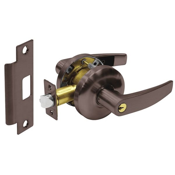 Lever Lockset, Cylindrical, Institutional, 6500 Series, Curved Style, Oxidized Bronze, Oil Rubbed Finish, Function Classroom, Keyway Type LA, Grade 2, Material Wrought and Cast Steel, Brass, Stainless Steel, For Door Thickness 1-3/8 to 1-3/4 In., Backset 2-3/4 In., Front Size Dimension 2-1/4 x 1-1/8 In., Crossbore Size 2-1/8 In., Key Type Nickel Silver, Number of Keys 2, Pins 6, ANSI 4-7/8 x 1-1/4 In. Curved Lip Strike, Cylinder Yes, Keying Different