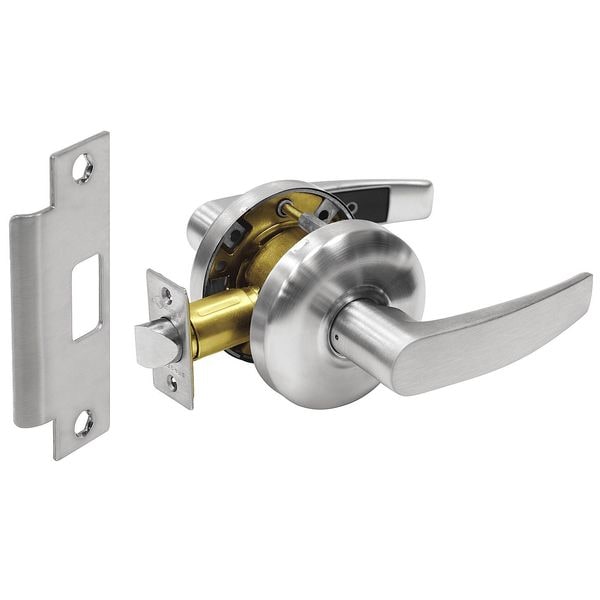 Lever Lockset, Cylindrical, Institutional, 6500 Series, Curved Style, Satin Chrome Finish, Function Passage, Grade 2, Material Wrought and Cast Steel, Brass, Stainless Steel, For Door Thickness 1-3/8 to 1-3/4 In., Backset 2-3/4 In., Front Size Dimension 2-1/4 x 1-1/8 In., Crossbore Size 2-1/8 In., ANSI 4-7/8 x 1-1/4 In. Curved Lip Strike, Keying Different, Standards Certified ANSI A156.2 Series 4000 Grade 1, UL and CSA Listed, ADA, California Administrative Code Title 19 and 24