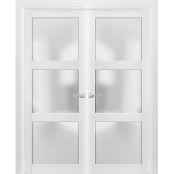 SartoDoors - the european doors of modern and traditional design. French style here! Best choice for bedroom, bathroom or closet - warm look and bright colors, high quality materials and soft opening. Finish - eco-veneer made in Italy. Door made of solid pine wood. Thickness of the door - 1 3/5". Thickness of the glass - 1/4", 3 lites of frosted glass. Doors are not pre-cut for the hardware. Assembly of frames and trims required. Doors work with all swing directions. Rough opening can be calculated: “door width” + 2 1/2”; “door height” + 2”. Set includes: - 2 doors slabs; - trims (2.95” wide); - frames (for wall thickness from 4” to 5 1/2”); - 2 passage lever/knob; - non-mortise hinges; NO FORMALDEHYDEEnvironmentally friendly using only latest eco-friendly materials. Company requirements the safest materials. We take care about your family. Sarto Doors are recommended for Applying in hospitals, childcare centers and networks catering. SOUND ATTENUATIONDoor's 1 3/5” thick solid composite wood construction yields 30% noise reduction over standard doors.CONSTRUCTIONDoor is manufactured from a single piece of composite wood and will give several generations of normal usage with minimal care. Door with frame, hung door, european door with molding, bedroom door.
