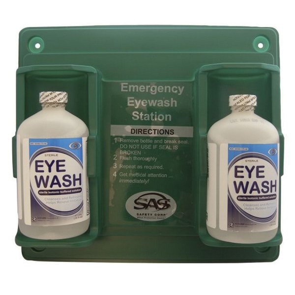Dual-bottle eyewash station for temporary first-aid until injured individual can reach a larger unitDurable plastic station includes 2-16 oz. bottlesBottles have twist-off tops with protective sealsDirections printed on station for fast reference Dual-bottle eyewash station for temporary first-aid until injured individual can reach a larger unitDurable plastic station includes 2-16 oz. bottlesBottles have twist-off tops with protective sealsDirections printed on station for fast reference
